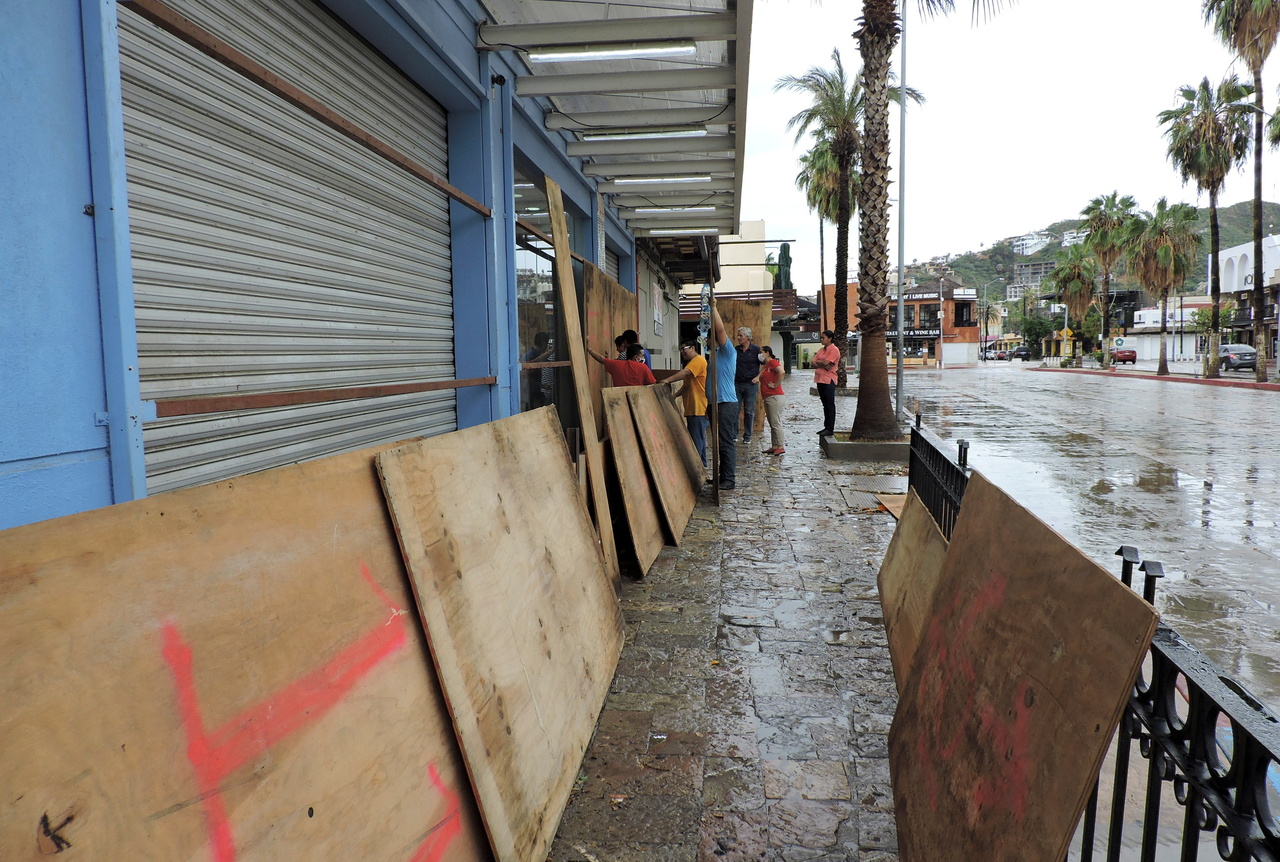 People boarding up a store ahead of the arrival of Hurricane Olaf in Cabo San Lucas on Sept 9, 2021.