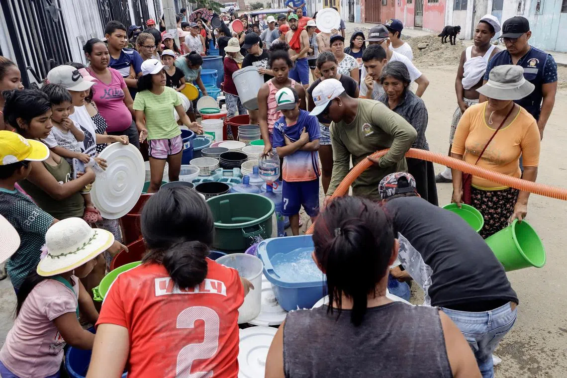 Residents in Trujillo, Peru, queueing on March 13 to get their buckets filled with get clean water in the aftermath of the Moche river overflowing because of torrential rains caused by Cyclone Yaku.