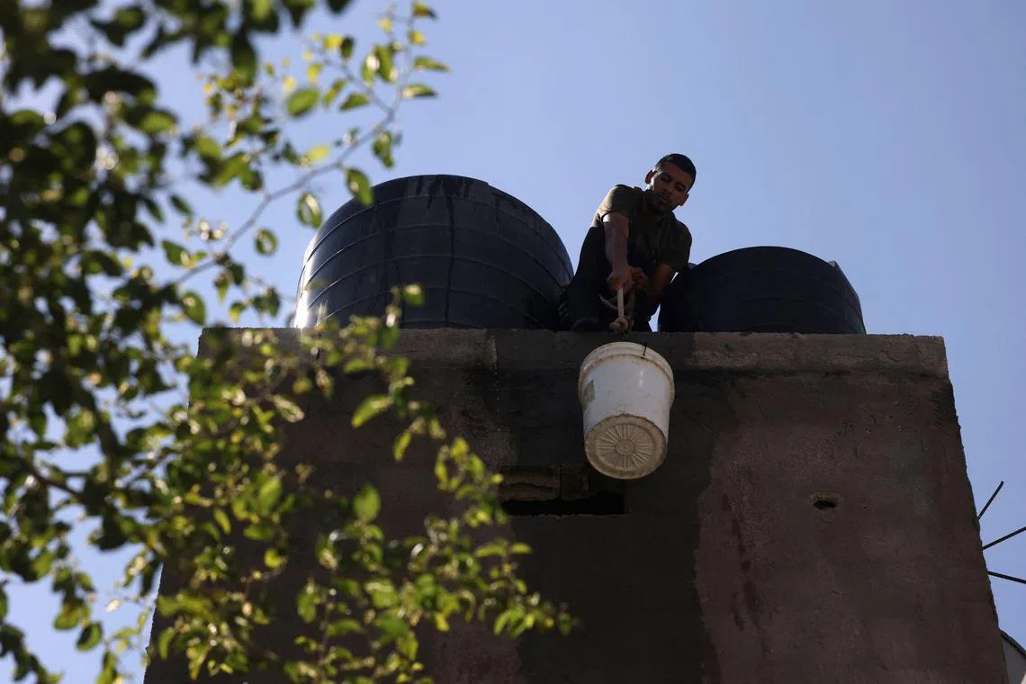 A man lifts a water bucket to the roof to refill a the water tank in a house in the Rafah refugee camp, in the southern of Gaza Strip on Oct 15, 2023.