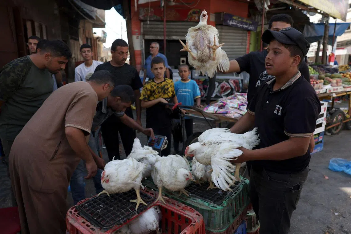 A Palestinian butcher sells chickens, due to lack of electricity to butcher them, at the Rafah refugee camp, in the southern of Gaza Strip, on Oct 15, 2023.