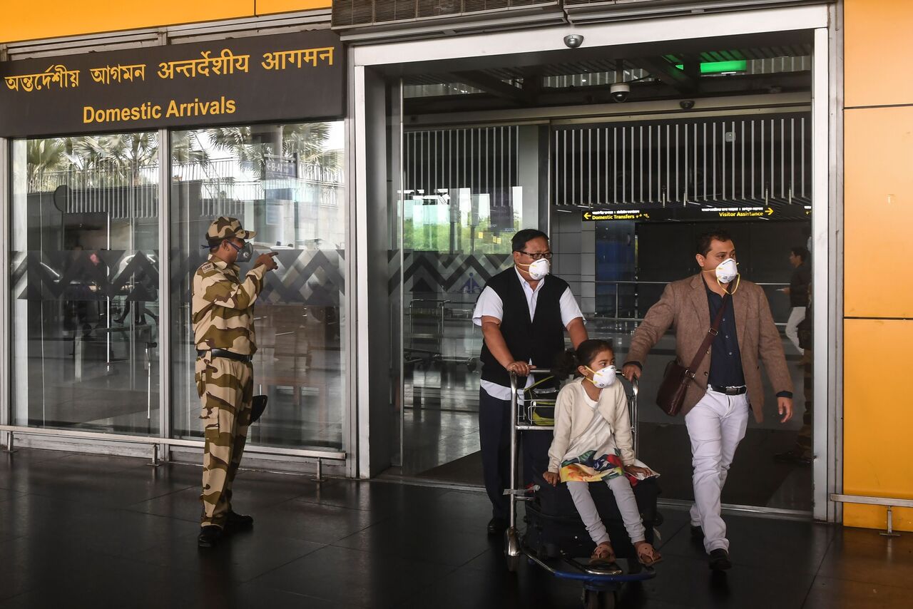 Passengers wearing facemasks exit the domestic terminal of the Netaji Subhash Chandra Bose International Airport in Kolkata on March 16, 2020.