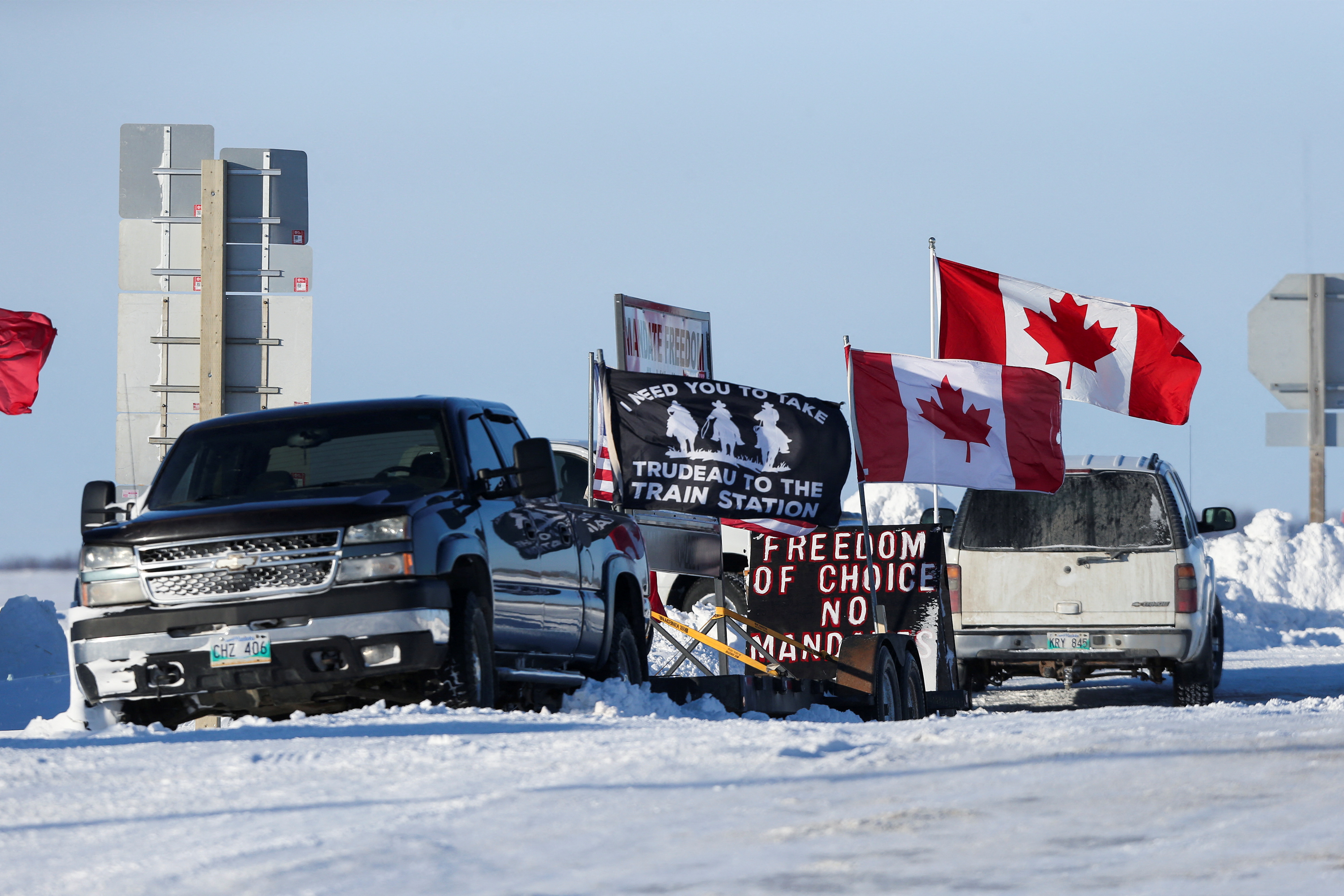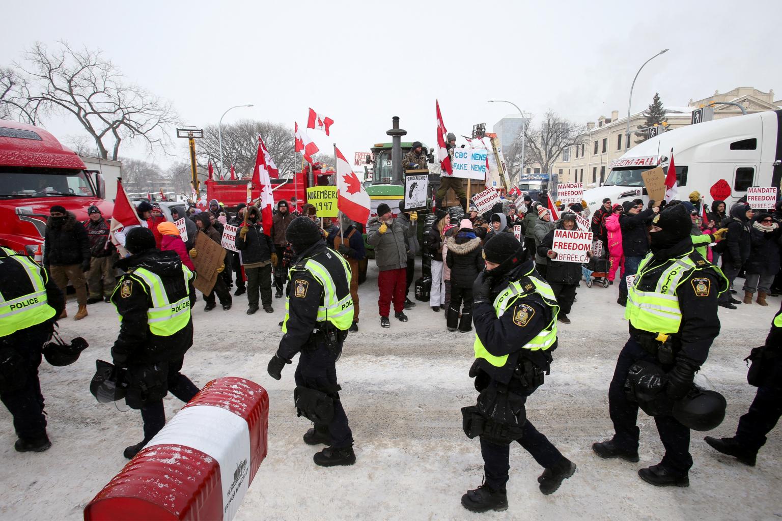 Police move to prevent truckers and their supporters who continue to protest against Covid-19 vaccine mandates in Manitoba, Canada, on Feb 12, 2022.