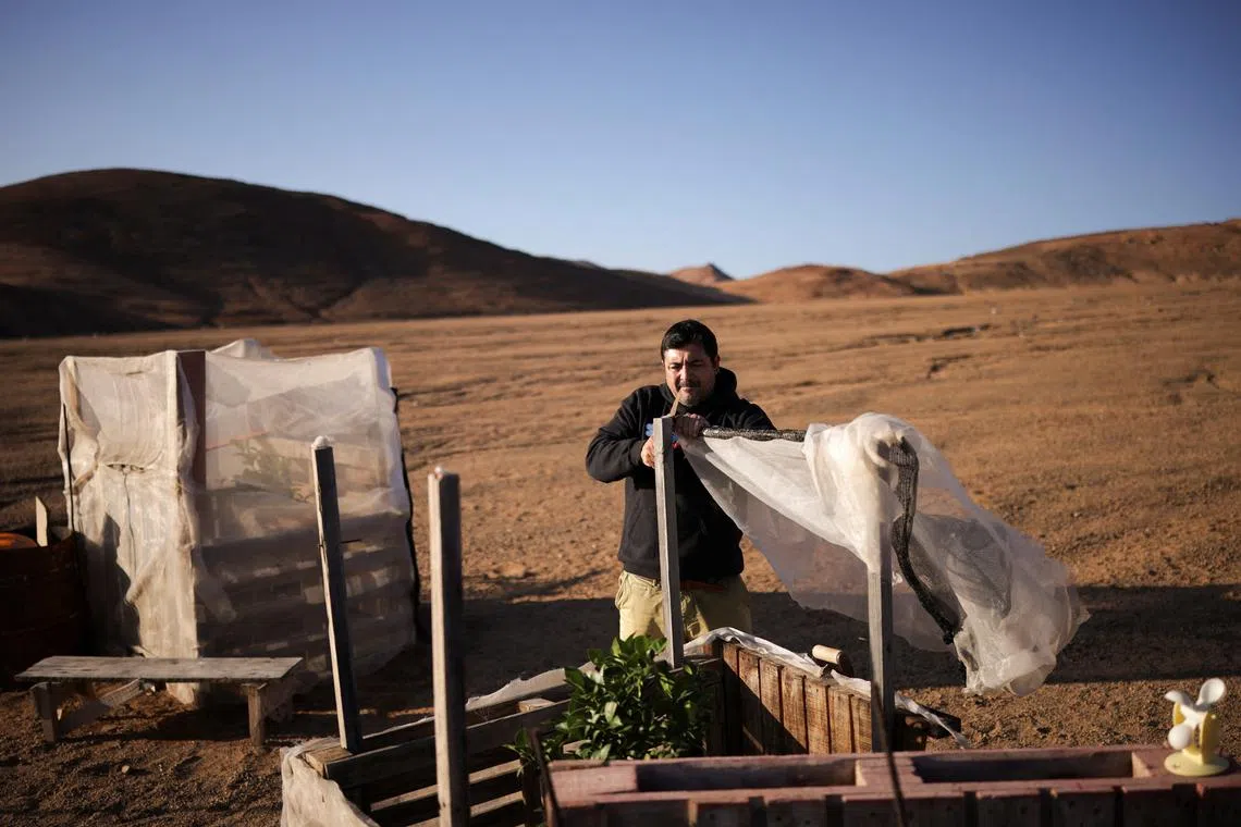 Mr Orlando Rojas removes a net from a greenhouse to uncover a lemon tree grown with water captured by fog catchers, who use meshes suspended between two poles that intercept tiny bits of moisture, to collect water from the air in the Atacama Desert, in Chanaral, Chile on June 10.