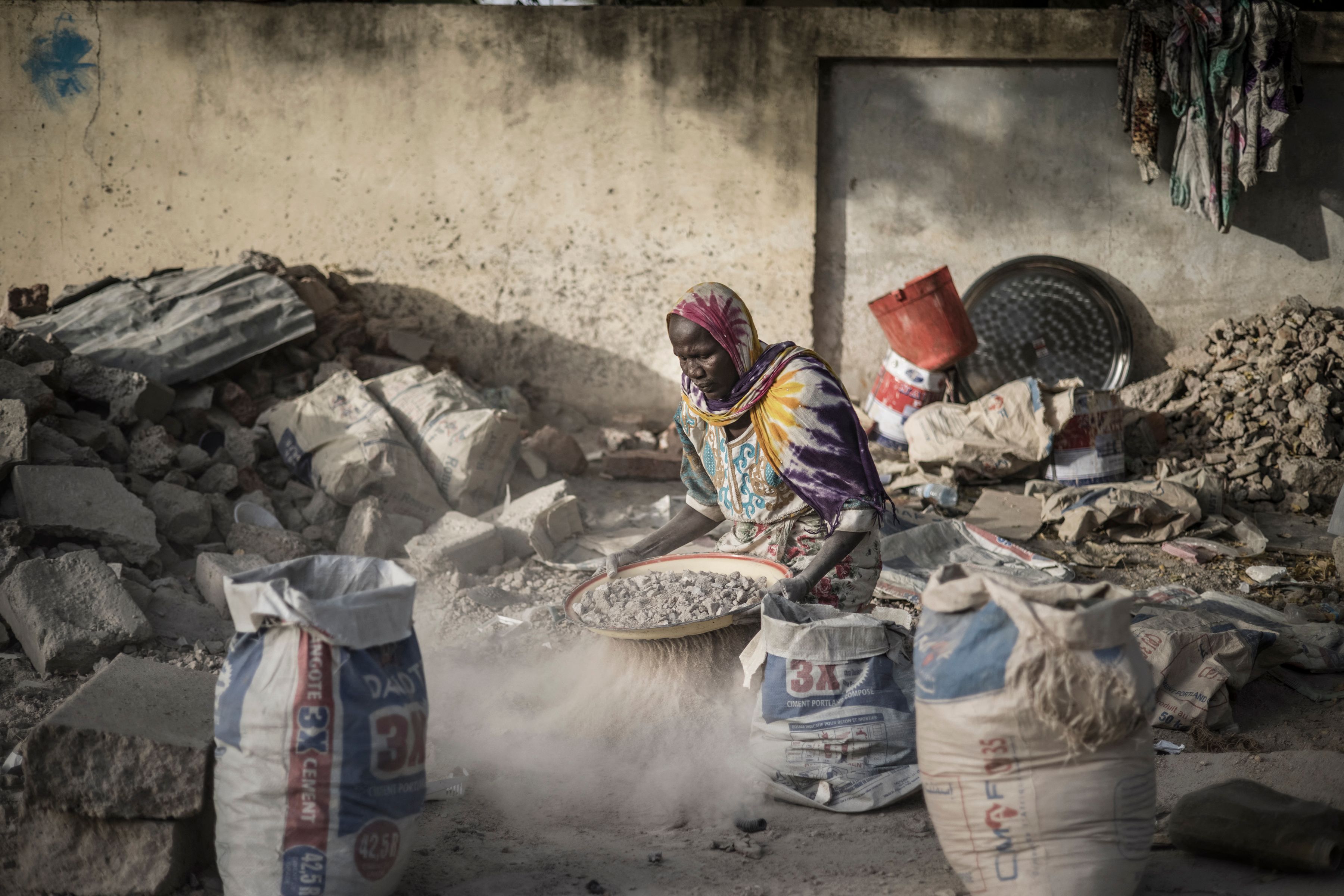 She has been crushing gravel for so long that the gestures of the job have become second nature. In the heart of N'Djamena, dozens of women spend up to 12 hours a day bent over this work, pulverising concrete, cement or brick chunks while children hover around them in the dust and heat of 45 degrees Celsius.