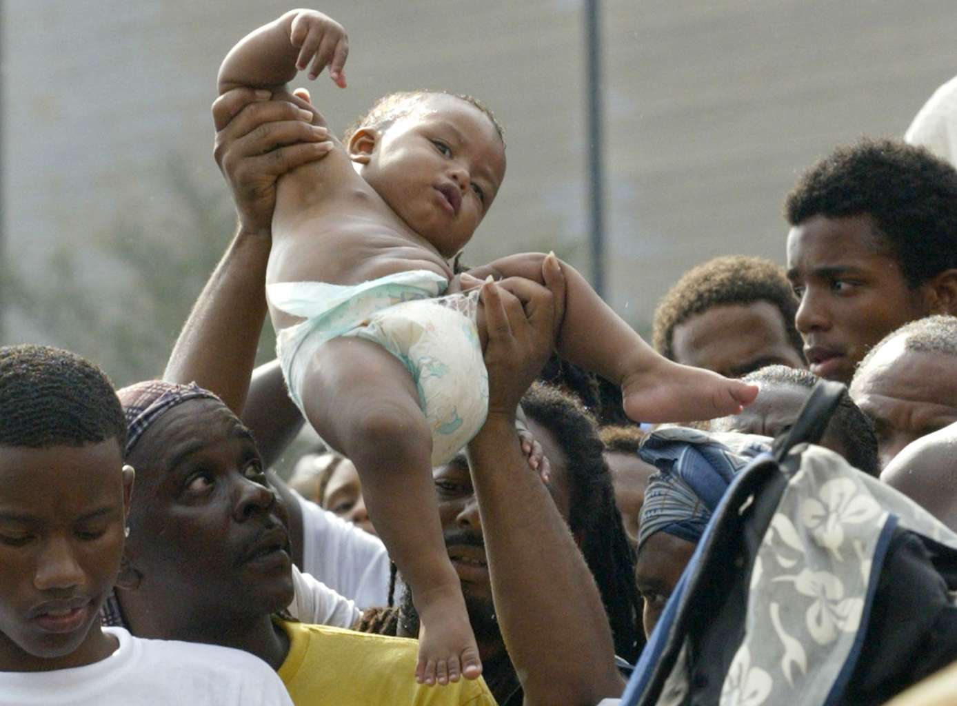 A file photo taken on Sept 1, 2005, showing a baby being passed above the crowd as people wait to leave the Superdome in New Orleans after Hurricane Katrina swept buildings off their foundations and deluged nearly all of New Orleans with floodwaters which rose so fast some people drowned in their homes.