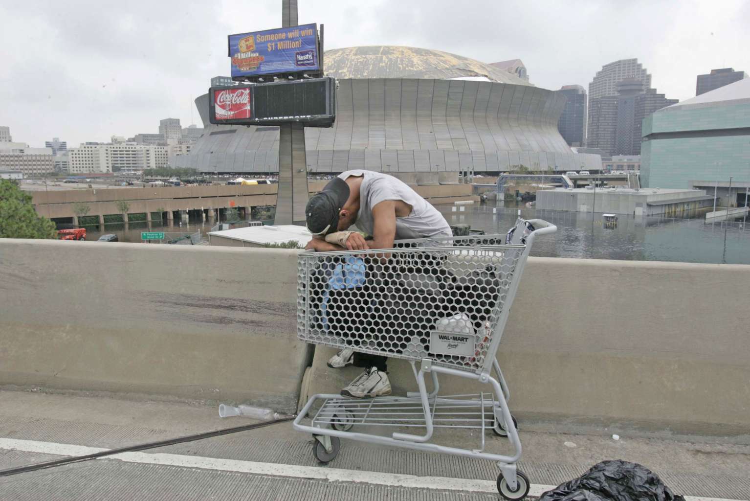 A file picture taken on Sept 1, 2005, showing a man with his head on a shopping cart across from the Superdome in New Orleans, Louisiana, in the aftermath of Hurricane Katrina.