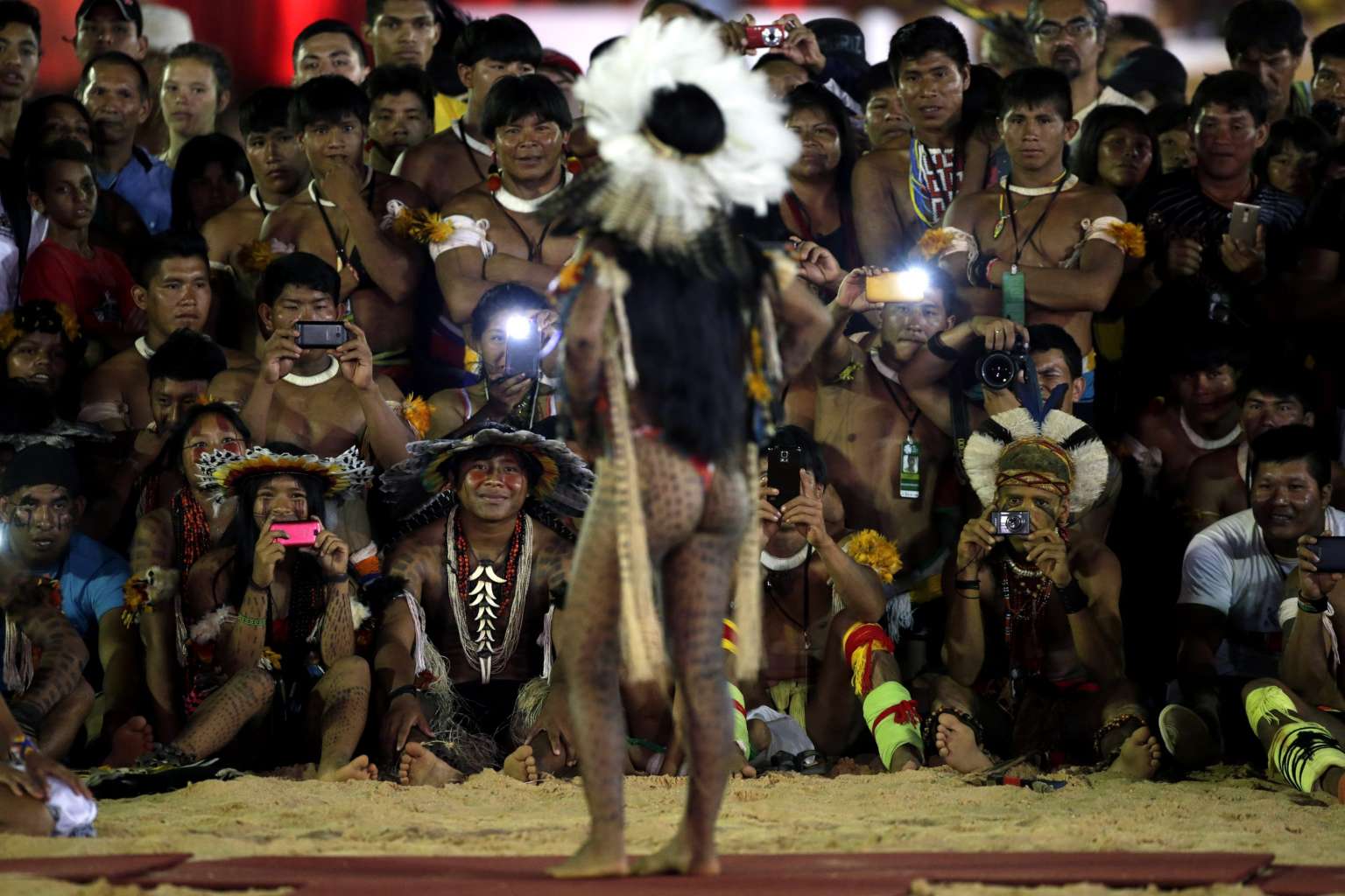 An indigenous man takes snapshots during the World Indigenous Games opening ceremony in Palmas, Tocantins, on Oct 23, 2015.