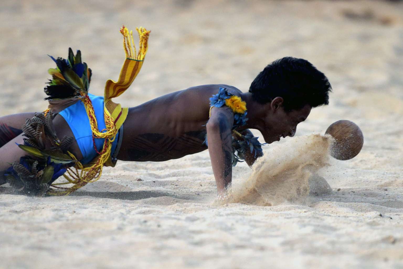 A Brazilian indigenous man of the ethnic group Paresi plays Xikunahati, a traditional sport also called hiara or head football, during the World Indigenous Games in Palmas, Brazil on Oct 26, 2015.