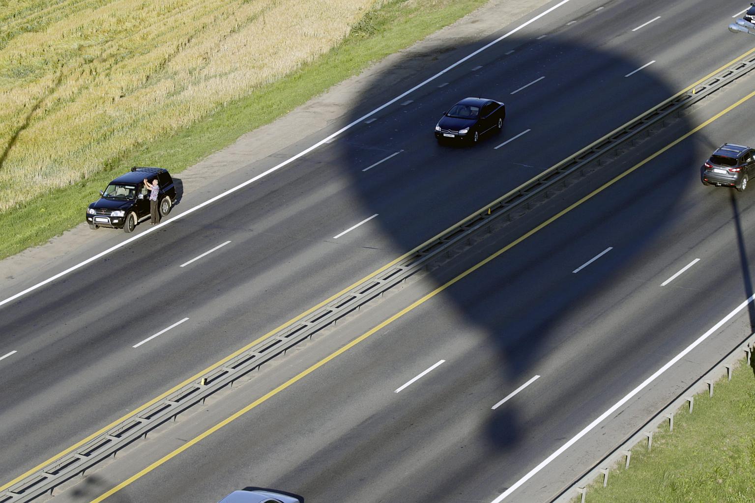 A shadow of a hot air balloon seen over a road, as a man takes pictures of flying hot air balloons, during the Second International Aeronautics Championship 70 Years Of Peaceful Sky on the outskirts of Minsk, Belarus, on July 18, 2015.
