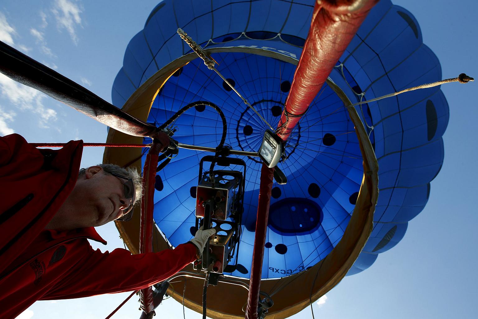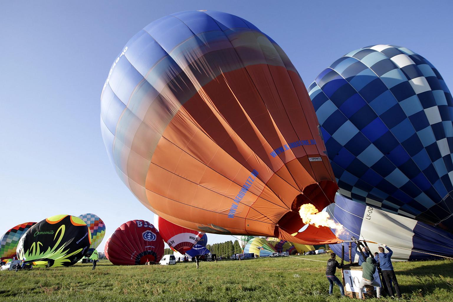 Aeronauts inflating hot air balloon before the start of flight during the Second International Aeronautics Championship 70 Years Of Peaceful Sky on the outskirts of Minsk, Belarus, on July 18, 2015.