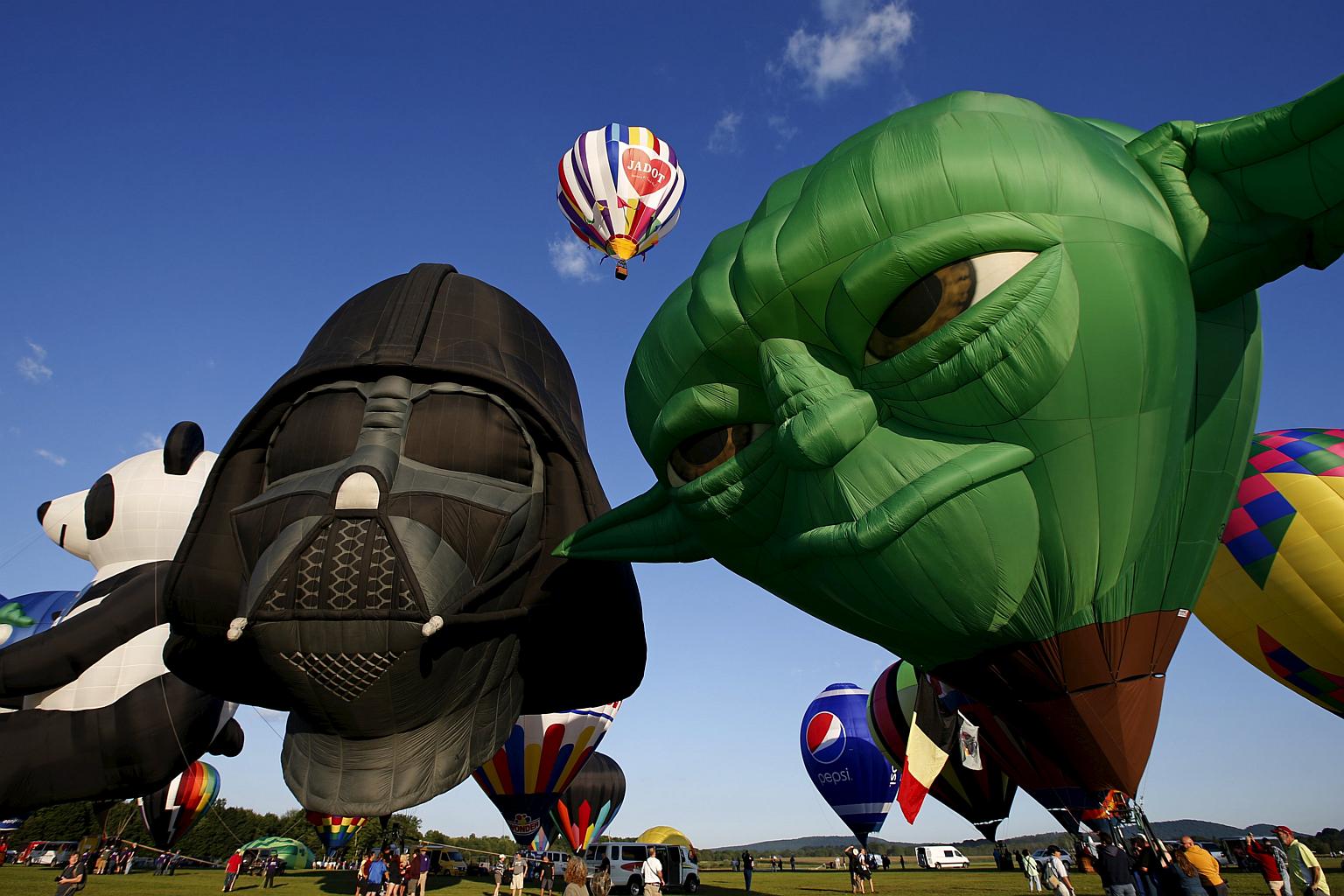 Hot air balloons shaped as Star Wars characters Darth Vader (left) and Yoda (right) are inflated at sunrise on Day 1 of the 2015 New Jersey Festival of Ballooning in Readington, New Jersey, on July 24, 2015.