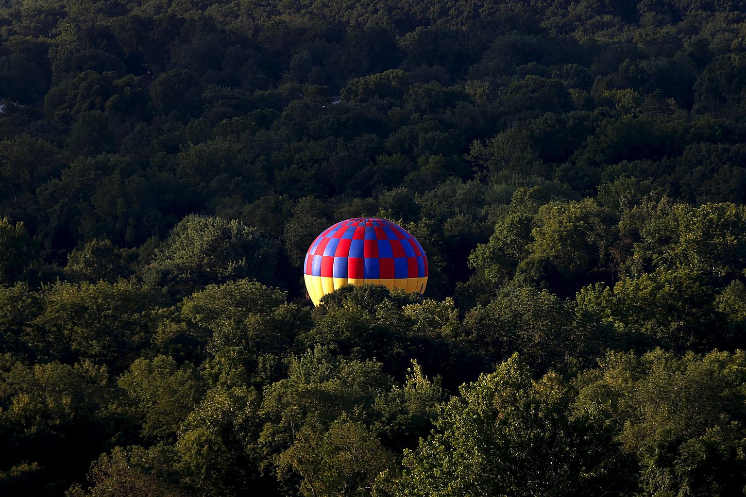 A hot air balloon coming to rest amid trees, as seen from a flying balloon just after sunrise on Day 1 of the 2015 New Jersey Festival of Ballooning in Readington, New Jersey, on July 24, 2015.
