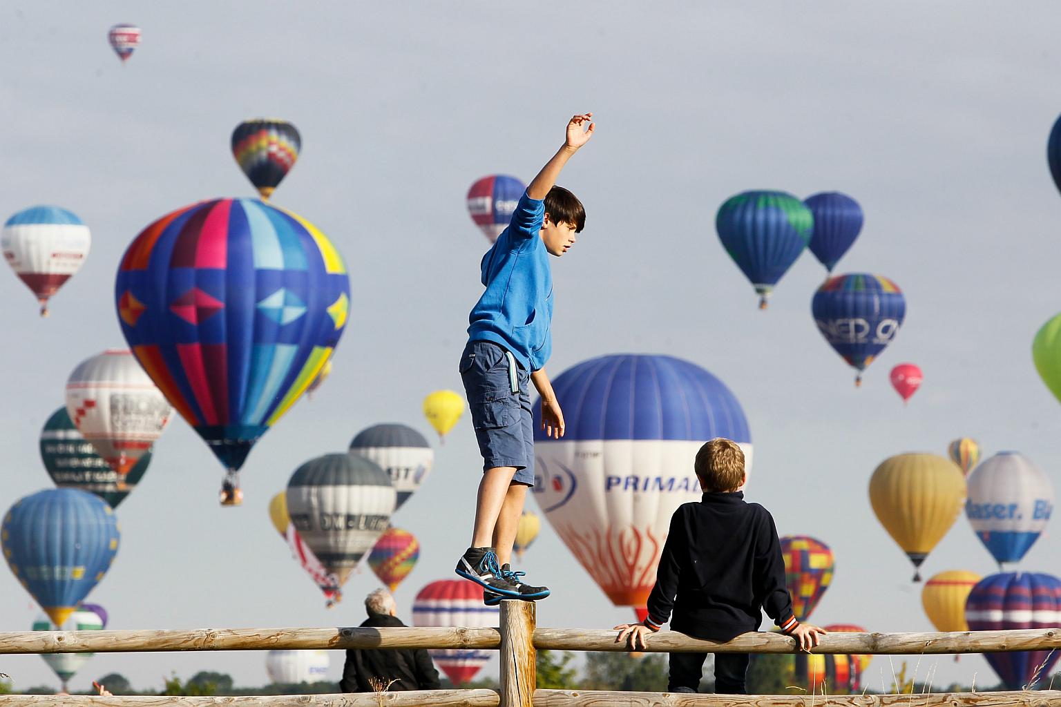 Boys playing on a gate as hot air balloons fly over the Chambley-Bussieres air base during the international Lorraine Mondial Air Ballons festival, in Chambley-Bussieres, eastern France, on July 26, 2015.