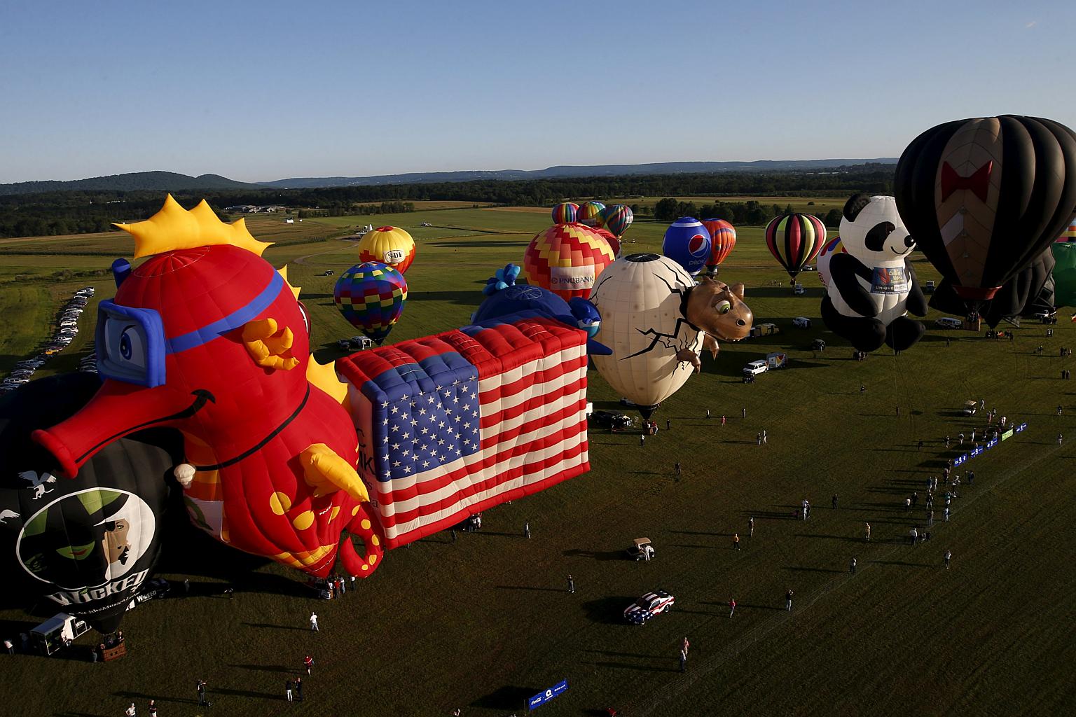 Hot air balloons in many shapes seen from a flying balloon just after sunrise on Day 1 of the 2015 New Jersey Festival of Ballooning in Readington, New Jersey, on July 24, 2015.