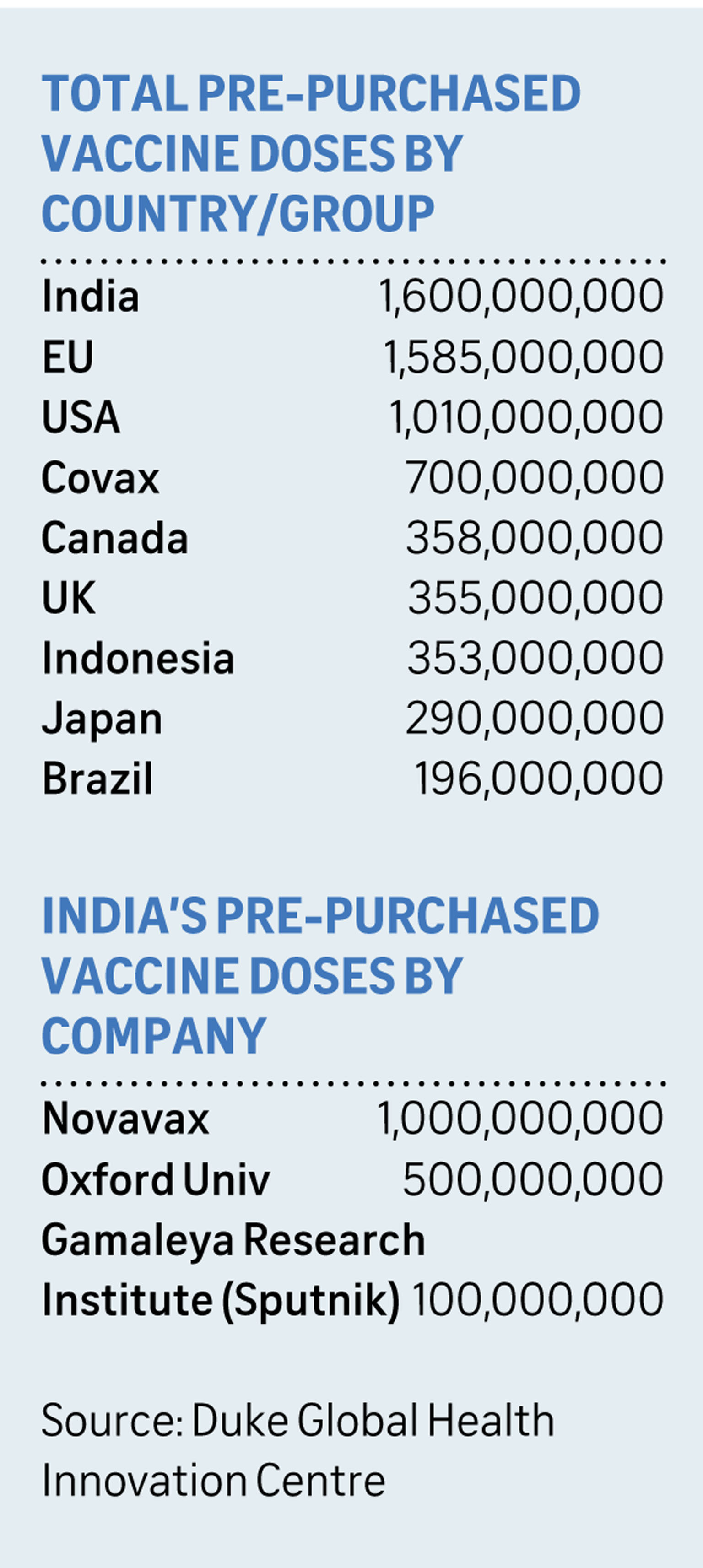 India, a middle-income country, bought more doses than high-income countries, such as the US and Britain, and more than the European Union as a whole, all of which have in-country vaccine development capacity.