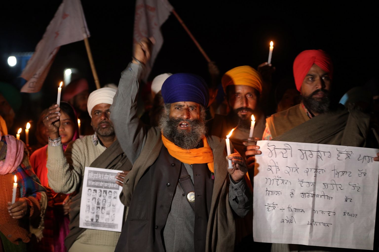 Indian farmers take part in a candle light vigil for farmers who lost their lives during protests against new agricultural laws.