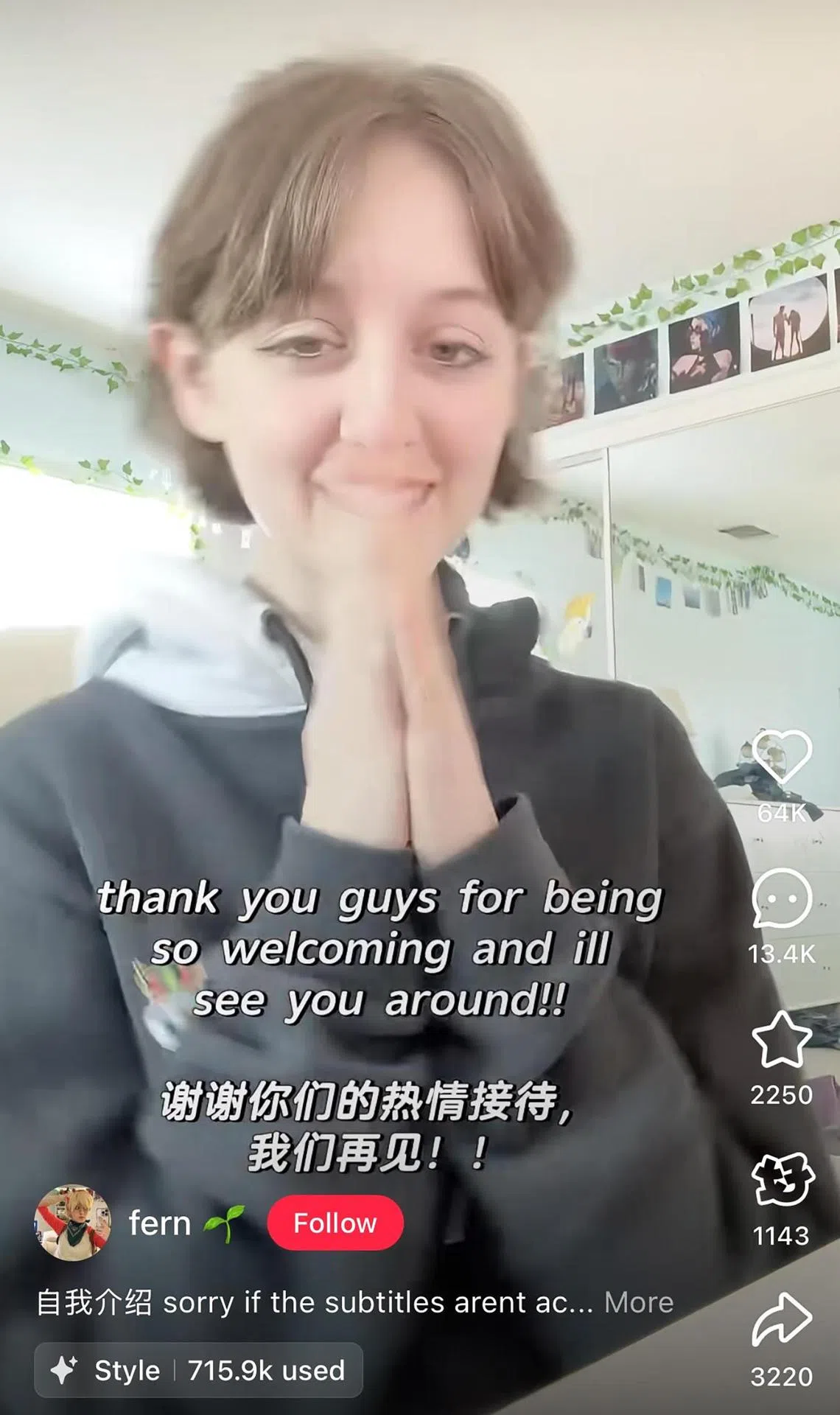 “Hi everyone, I’m a TikTok refugee. I literally just got this app an hour ago; so far everyone has been so nice,” said a brown-haired American teenager with the moniker “fern” in a video posted on Jan 13. She added Chinese captions to her video to reach out to the new online community.