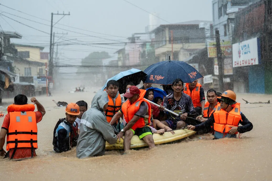 Rescuers help residents of Marikina City, Metro Manila, on a rubber raft as they wade through a flooded road following heavy rains brought by Typhoon Gaemi in the Philippines.
