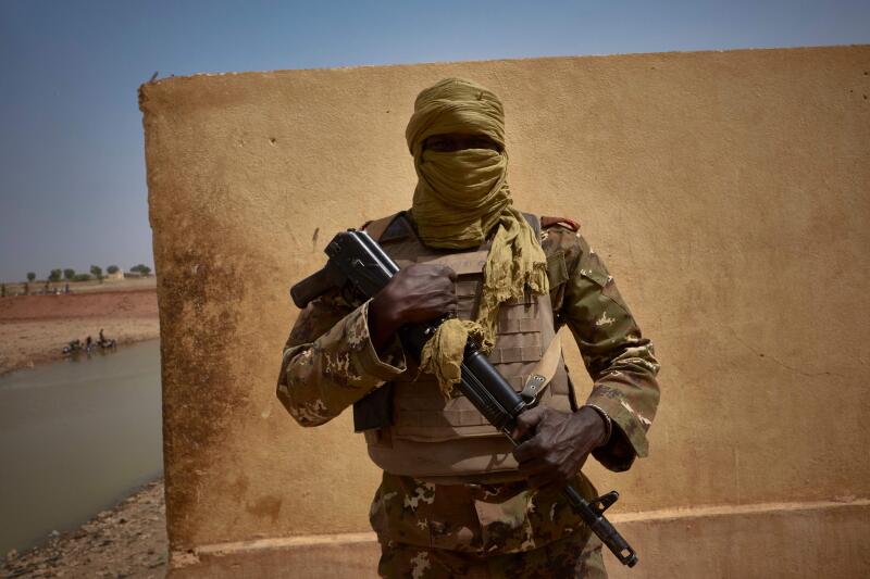 A Malian soldier stands by the river bank in Konna on March 20, 2021.