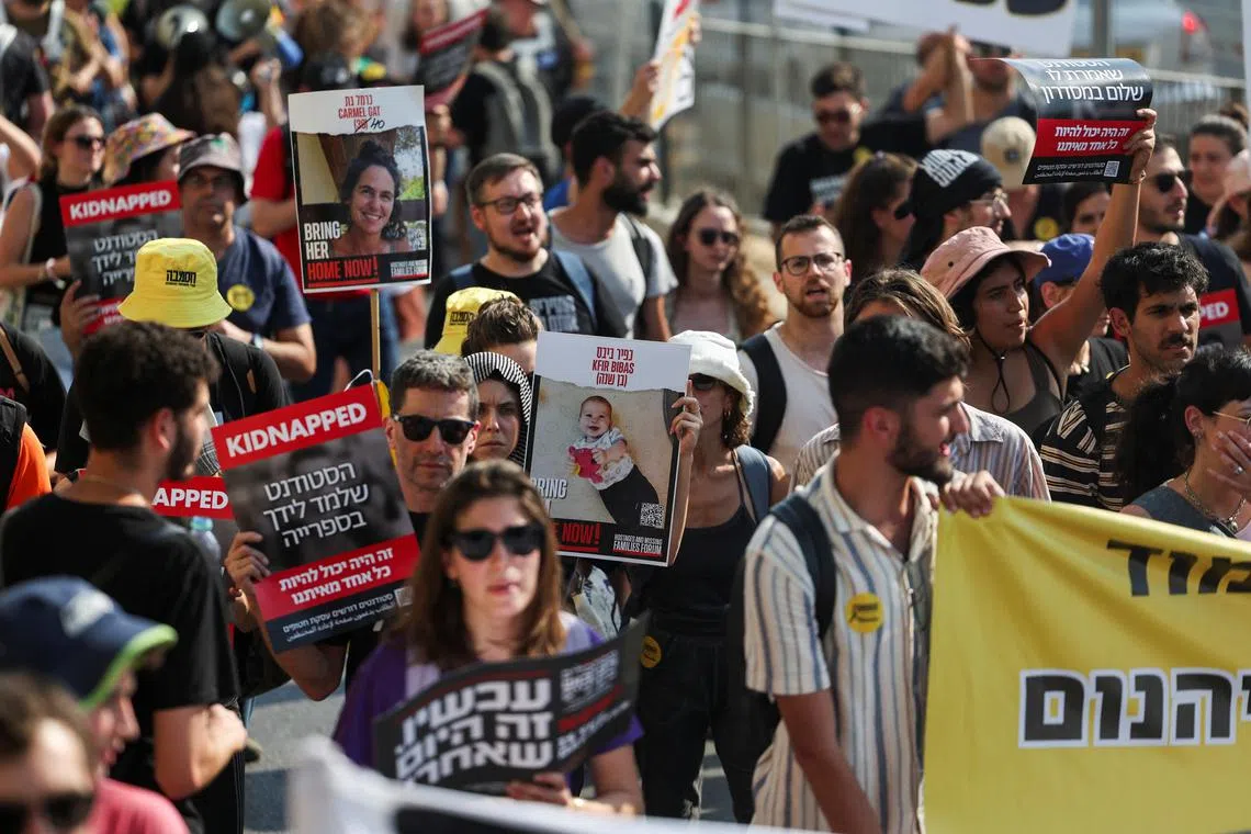 People taking part in a protest demanding the immediate release of hostages in Jerusalem on June 13.