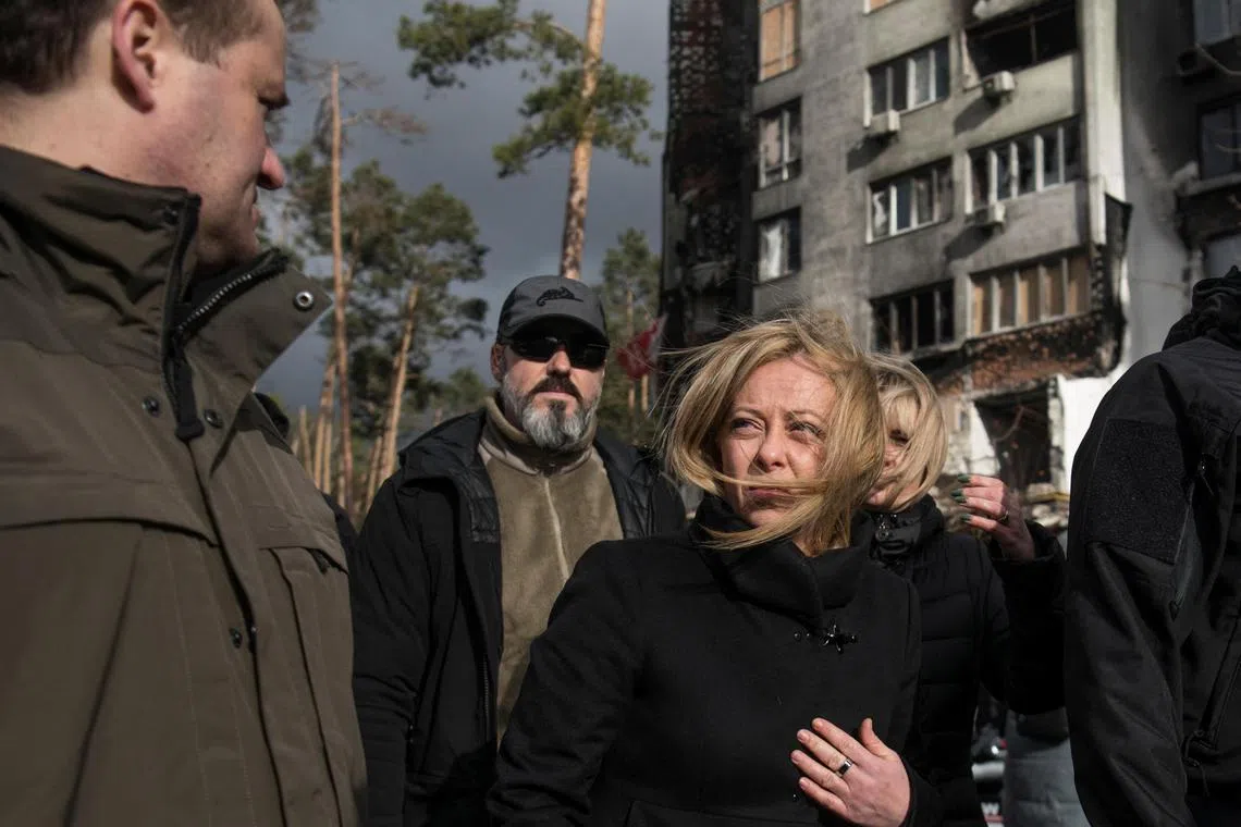 Italian Prime Minister Giorgia Meloni visits a residential area heavily damaged during Russia's attack on Ukraine in the town of Irpin, outside Kyiv.
