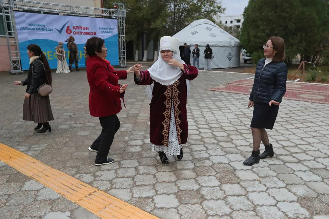 People dancing outside a polling station in the village of Ulken in the Almaty region on Oct 6. Ulken has been designated as the site for the plant.