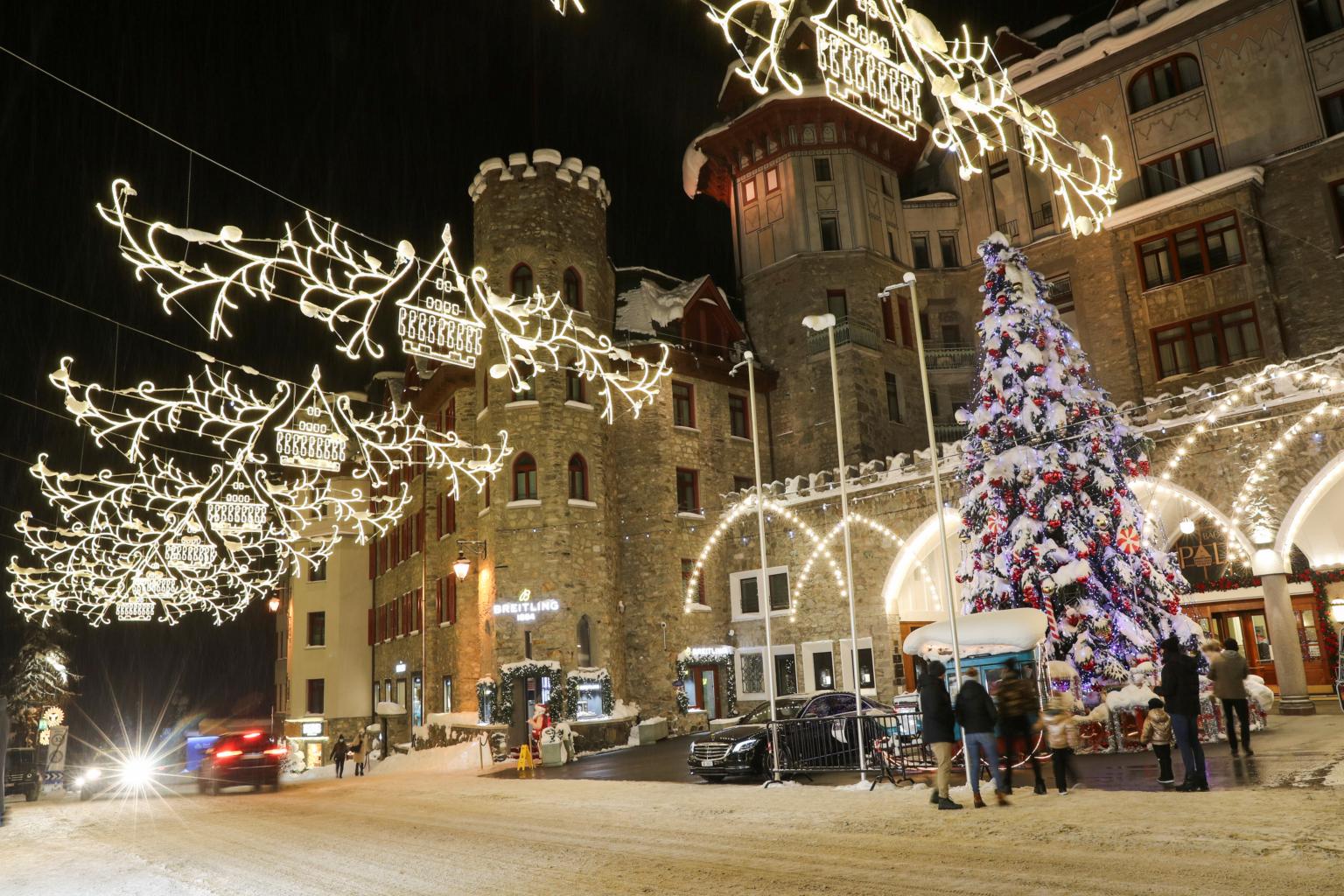 Christmas lights in front of the Badrutt's Palace hotel in the Alpine resort of St Moritz, Switzerland, on Dec 11, 2020.