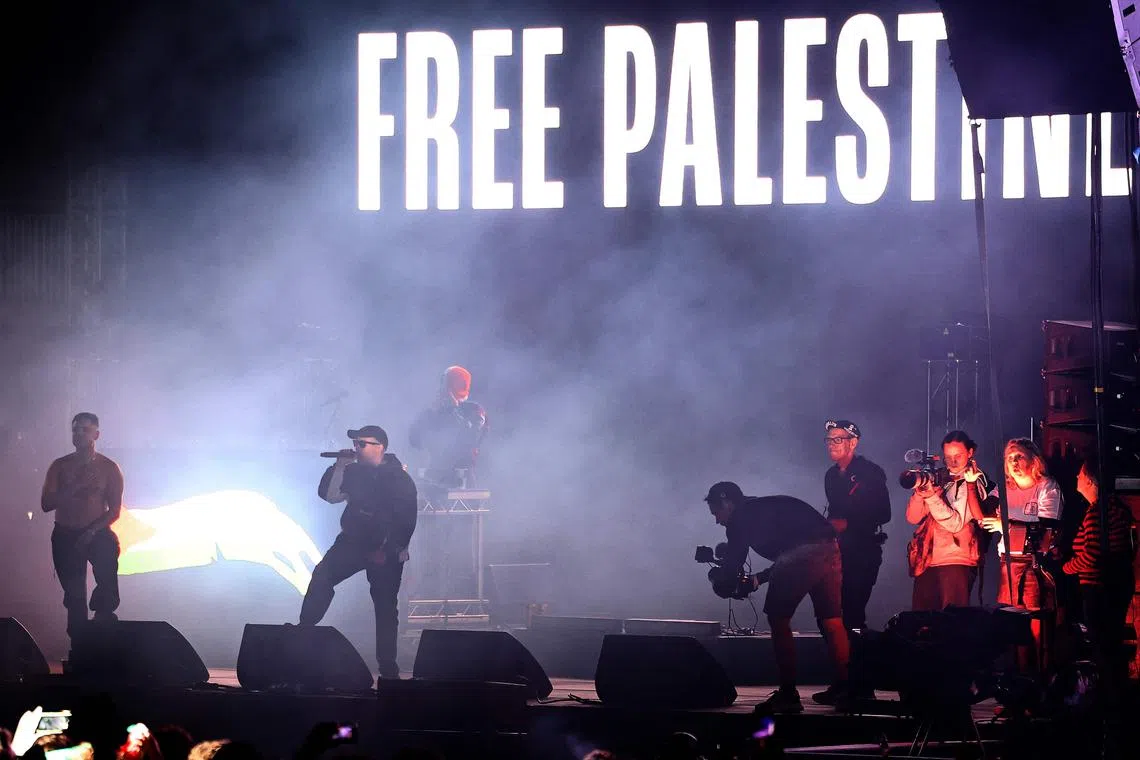 Other videos circulating online appear to show a band member shouting “up Hamas, up Hezbollah”.
