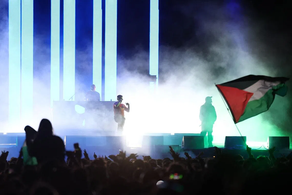 Festival attendees flying a Palestine flag as O’Hanna performs with bandmates during Wide Awake Festival 2025 at Brockwell Park in south London on May 23.