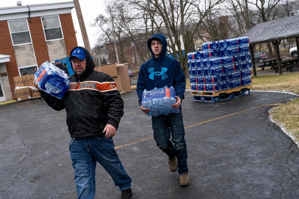 Volunteers Shawn Mitchell and Braden Cianni distribute cases of water to residents in Palestine, Ohio, on Feb 17, 2023.
