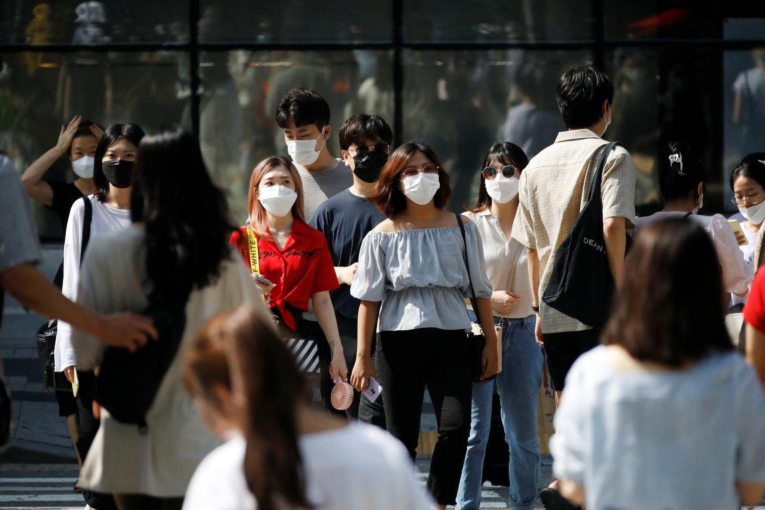 Pedestrians wearing masks walk on a zebra crossing in Seoul on Aug 25, 2020.