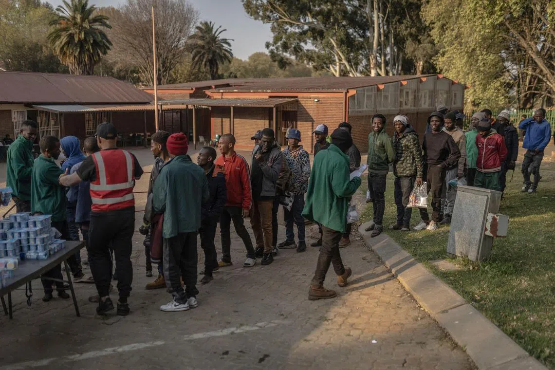 Survivors of the fire waiting in line to receive donated food, at a provisional shelter in Johannesburg on Sept 1.