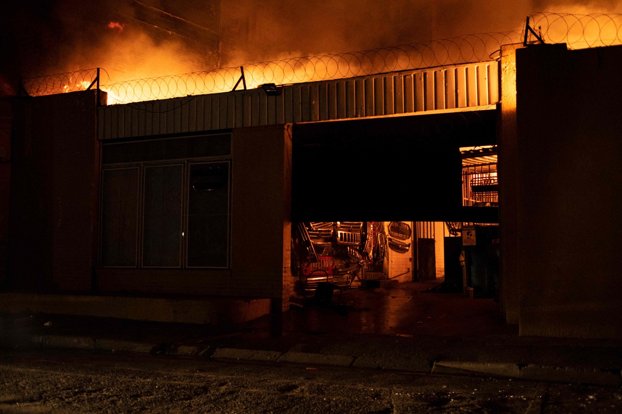An auto spare parts shop burns during protests in Johannesburg, South Africa, on July 11, 2021.