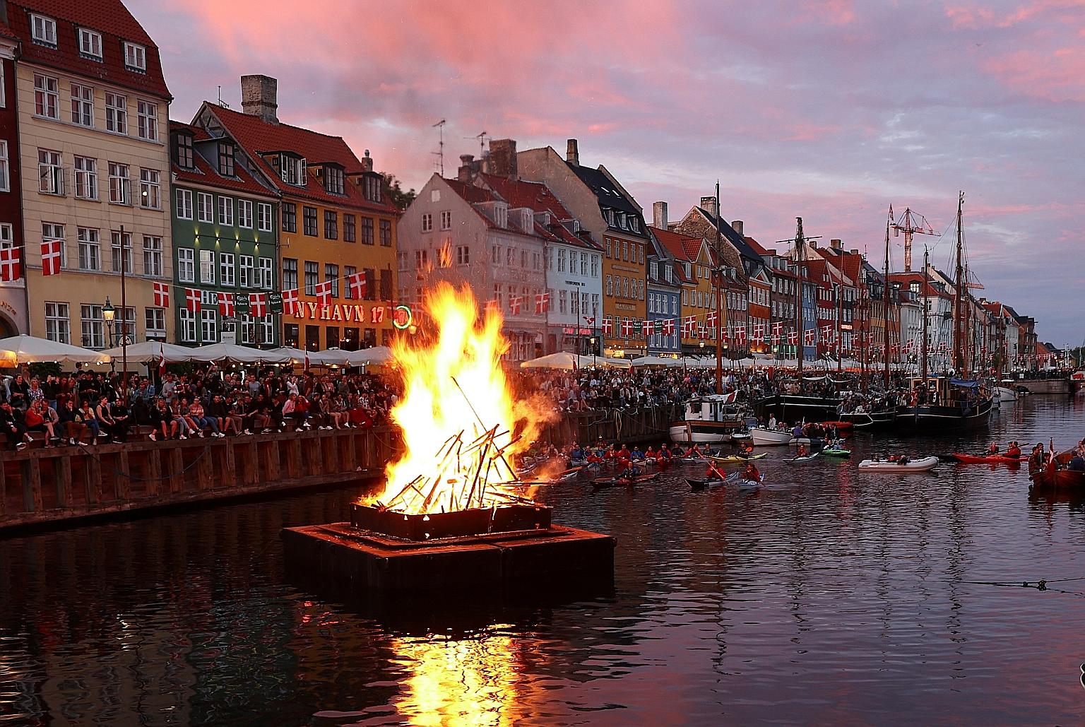 On Wednesday, the city lit a wooden bonfire on a metal platform floating on water to celebrate the midsummer solstice.