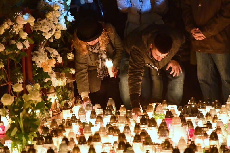 People lay flowers and candles at the site of the 'Escape Room' fire tragedy in Koszalin, Poland, on Jan 6, 2019.