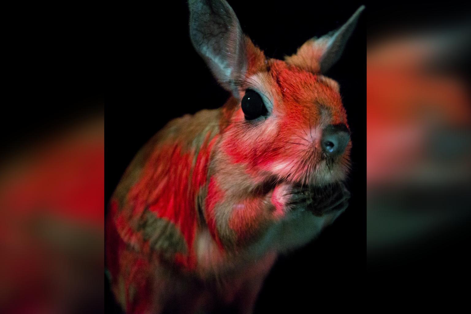The springhare's coat glows a patchy pinkish-orange under UV light.