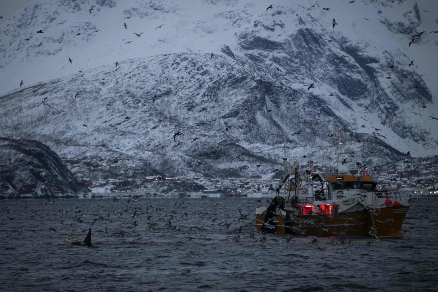 SKJERVOY, NORWAY (AFP) - In the pale winter darkness of northern Norway, a huge flock of seagulls circles above an Arctic fjord, signifying the presence of a group of unusual predators in the water below.