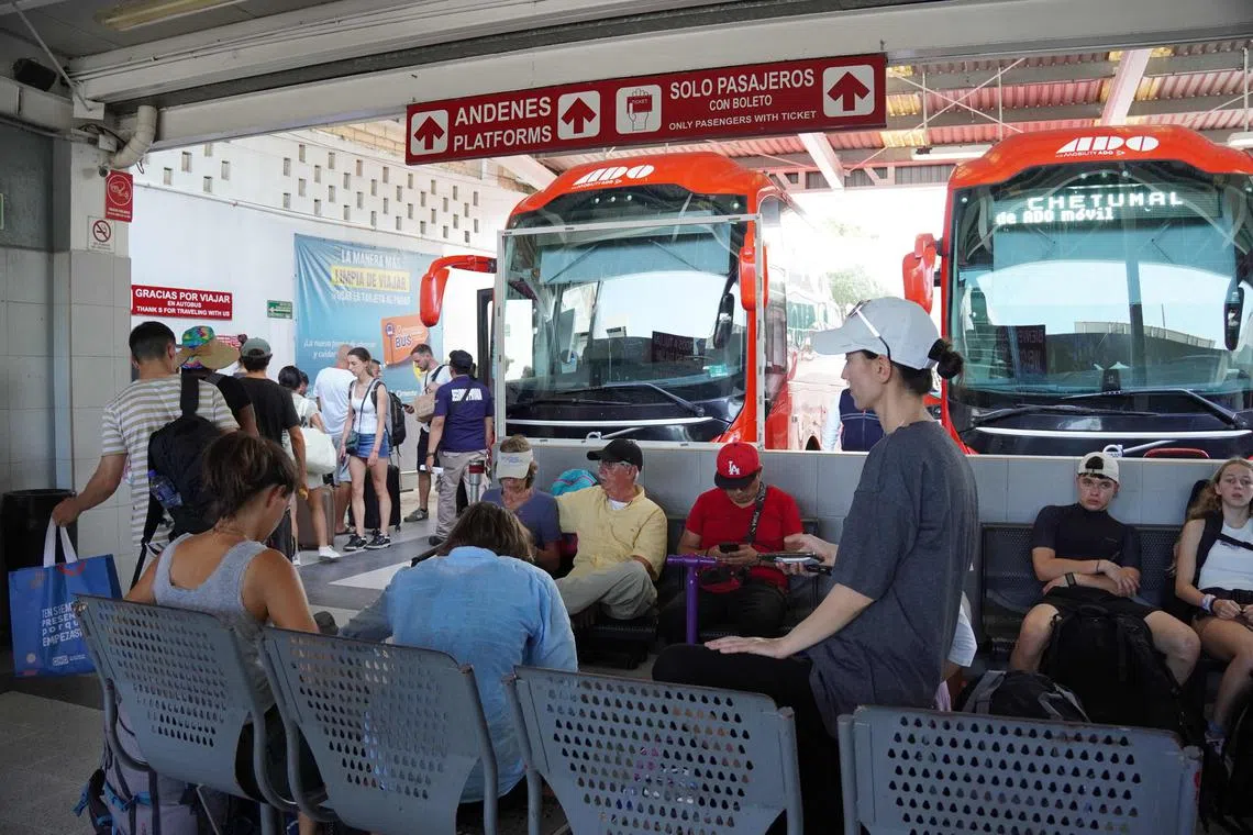 Tourists wait at a bus terminal to leave for Cancun to escape Hurricane Beryl in Tulum on July 4.