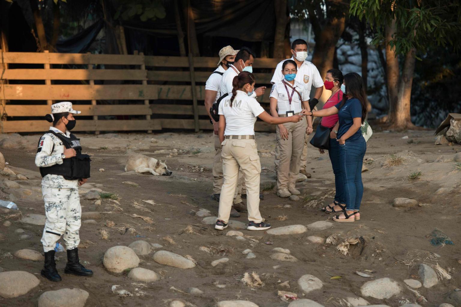 Officers checking the documents of people who cross the Suchiate River from Guatemala to Ciudad Hidalgo, Mexico, on Jan 19, 2021.