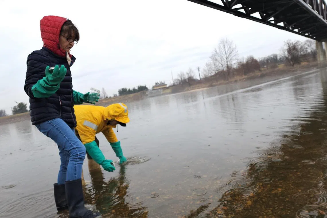In their knee-length rubber boots and wearing elbow-length rubber gloves, hunched under their rain hoodies in the dark shadow of an old iron pedestrian bridge, they take water and sediment samples to check later in their labs for microplastics.