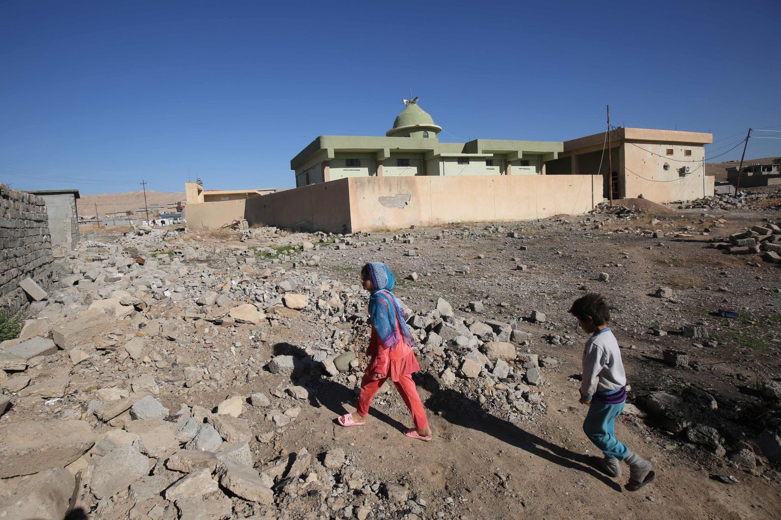 Iraqi children from the Shabak community walking past their house, which was destroyed by ISIS, in the village of Baz Gerkan near Mosul on Jan 10, 2018.