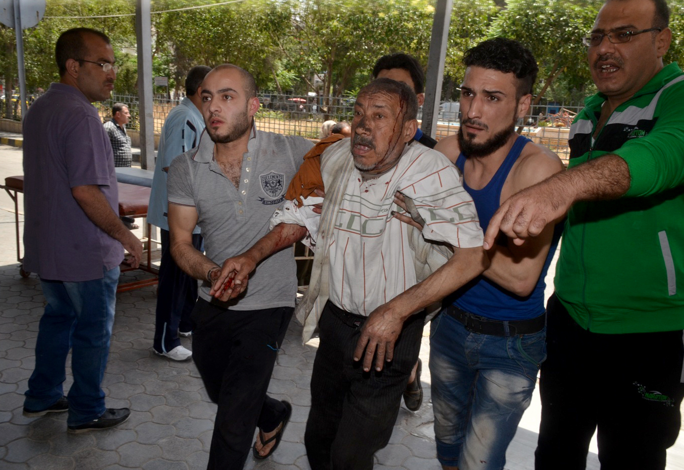 An injured Syrian man is helped outside a hospital following shelling on the government-held Meidan neighbourhood, in the northern Syrian city of Aleppo, on May 27, 2016.