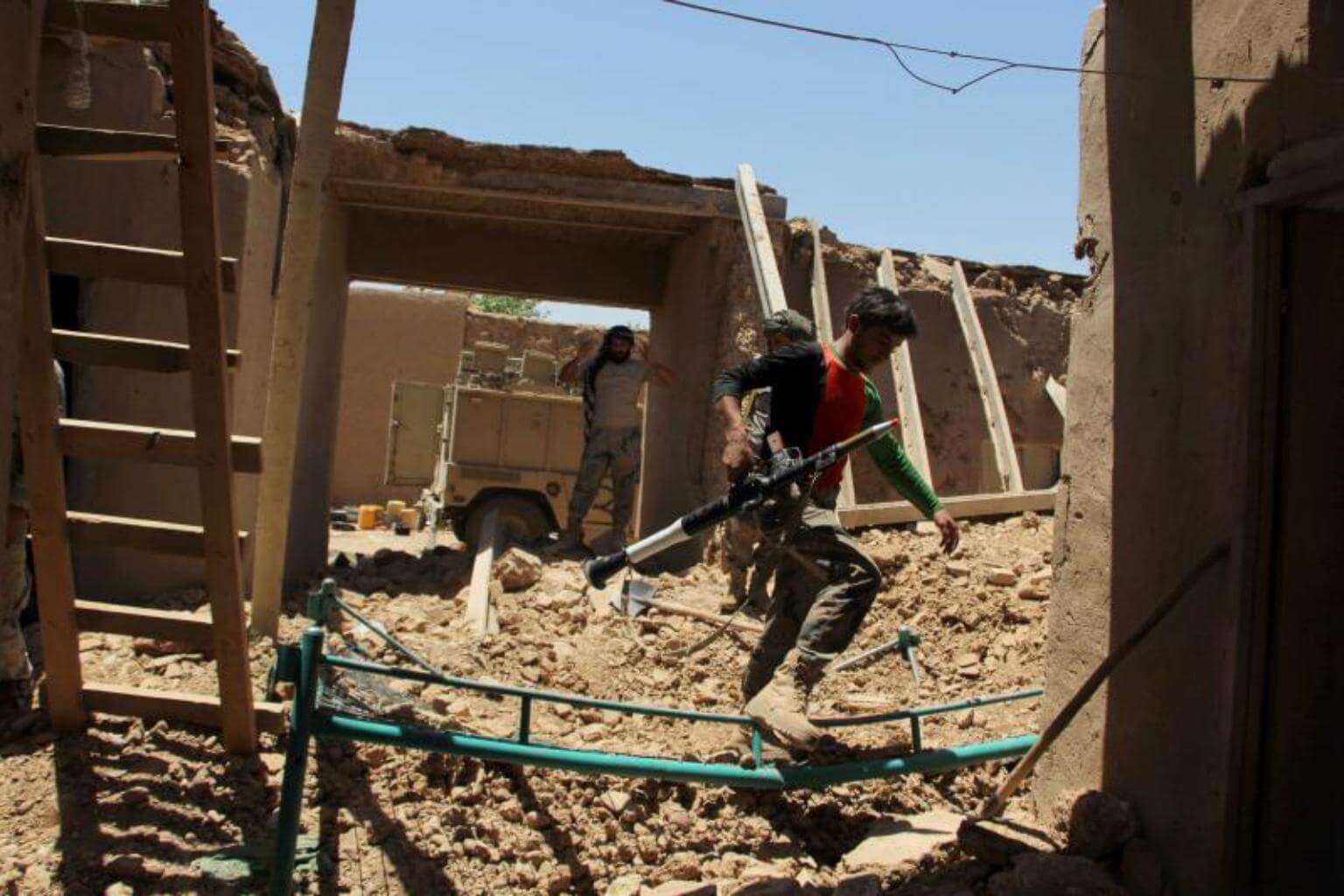 Afghan Border Police personnel walk through an outpost damaged in an airstrike in the Nad Ali district of Helmand province on June 10, 2017.