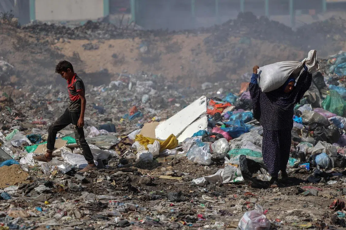 Palestinians searching for salvageable items in a rubbish dump, which sprawls across what used to be the Firas market in Gaza City, on June 24, 2024.