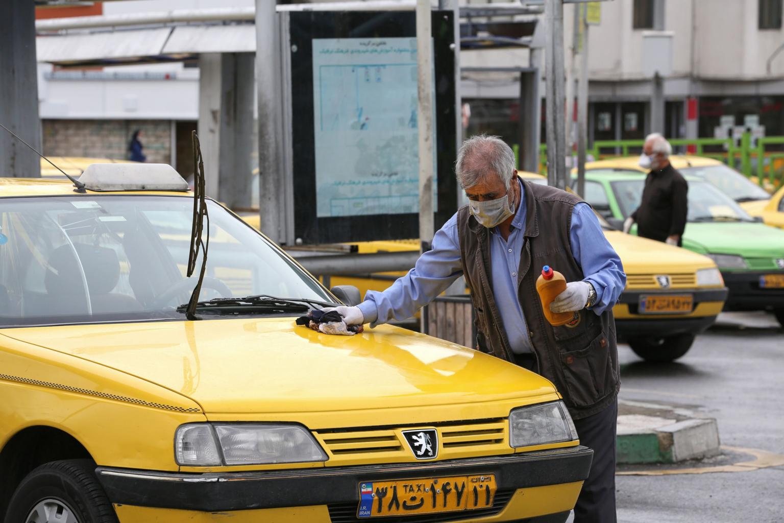 A taxi driver cleans his car while waiting for passengers at Aryashahr station, west Teheran on April 26, 2020.