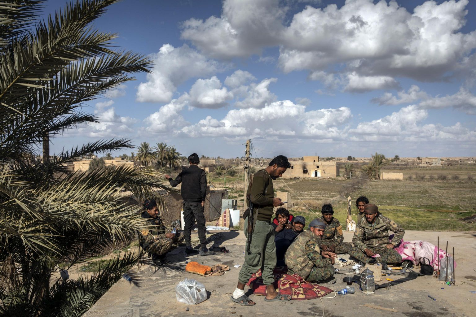 American-backed Syrian Democratic Forces fighters on a rooftop near the village of Baghuz, the last town in Syria held by the Islamic State, on Feb 2, 2019.