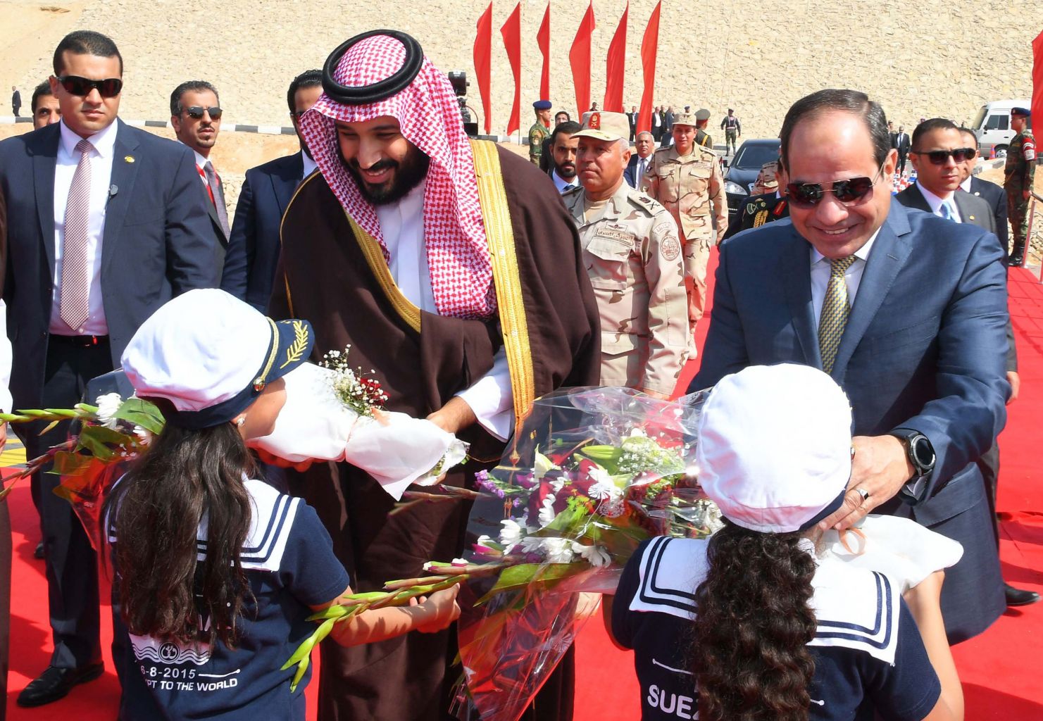 Egyptian President Abdel Fattah al-Sisi and Saudi Arabia's Crown Prince Mohammed bin Salman receive flowers as they visit the Suez Canal on March 5, 2018.