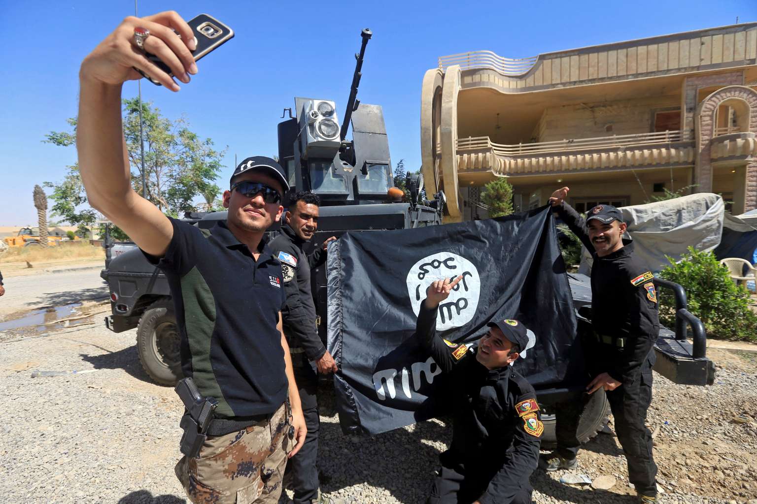 Members of the Iraqi Army are photographed with an ISIS flag, claimed after fighting with ISIS militants in western Mosul, Iraq, on June 26, 2017.
