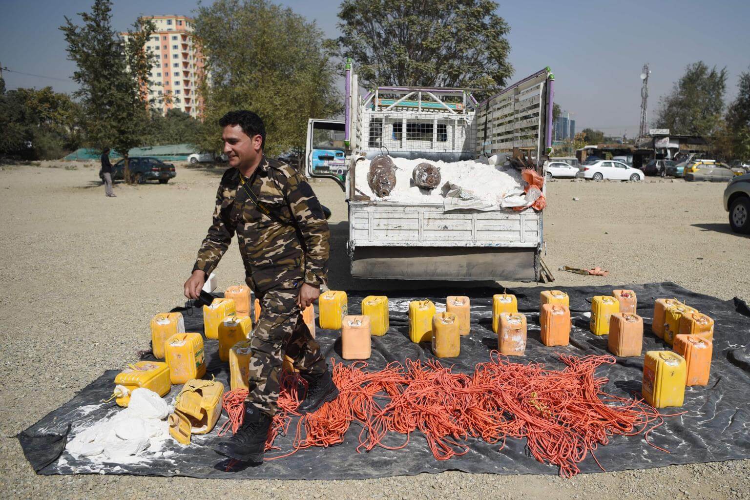An Afghan security force personnel walks next to containers filled with explosive material after presenting to the media at the National Directorate of Security (NDS) headquarters in Kabul on Oct 15, 2017.