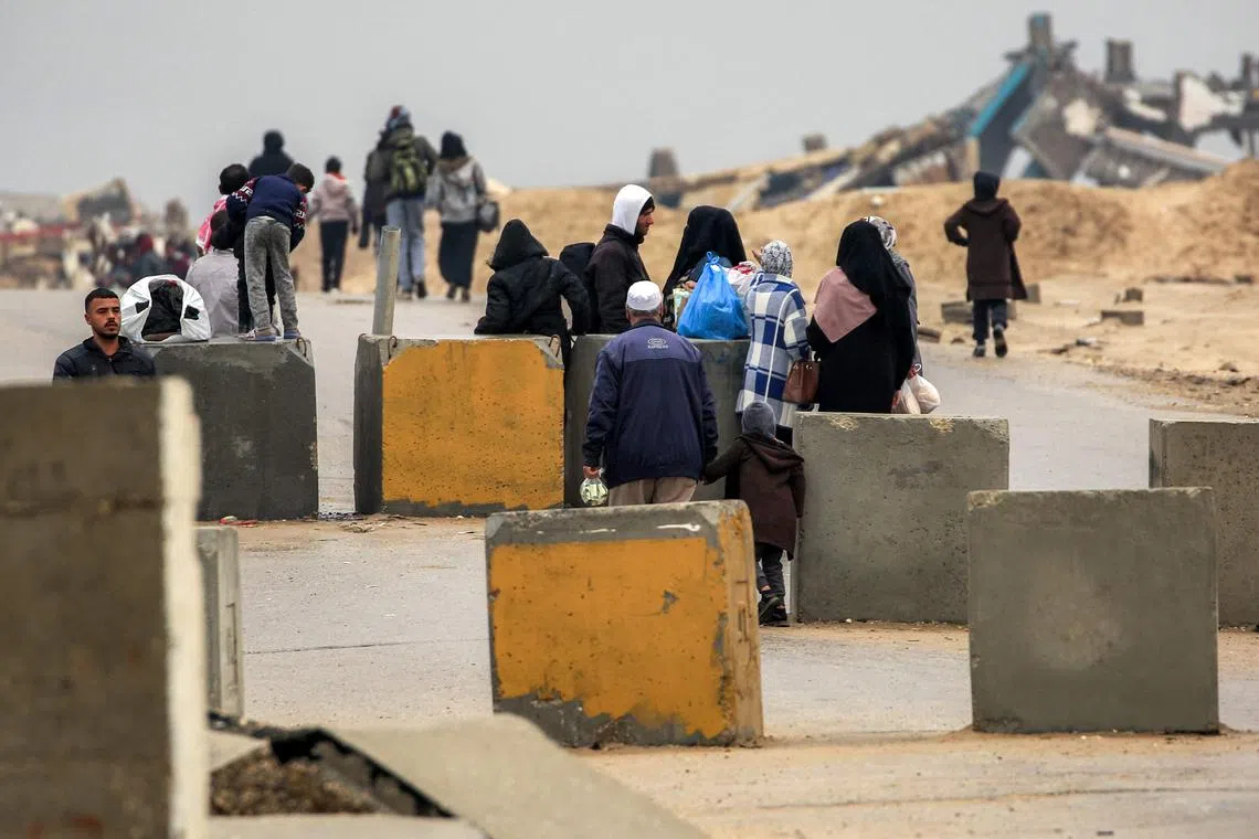 People crossing concrete barriers erected in the Netzarim Corridor, which bisects Gaza, in February 2025.
